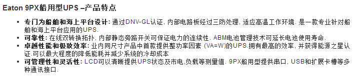 9PX 船用型UPS是業(yè)內(nèi)同尺寸產(chǎn)品中首款提供整功率因素 (VA=W)的UPS. 比其他UPS提供多11%的能量. 9PX船用型擁有最高的效率, 并獲得能源之星認(rèn)證.可以最大程度的降低能耗并減少系統(tǒng)的冷卻成本.